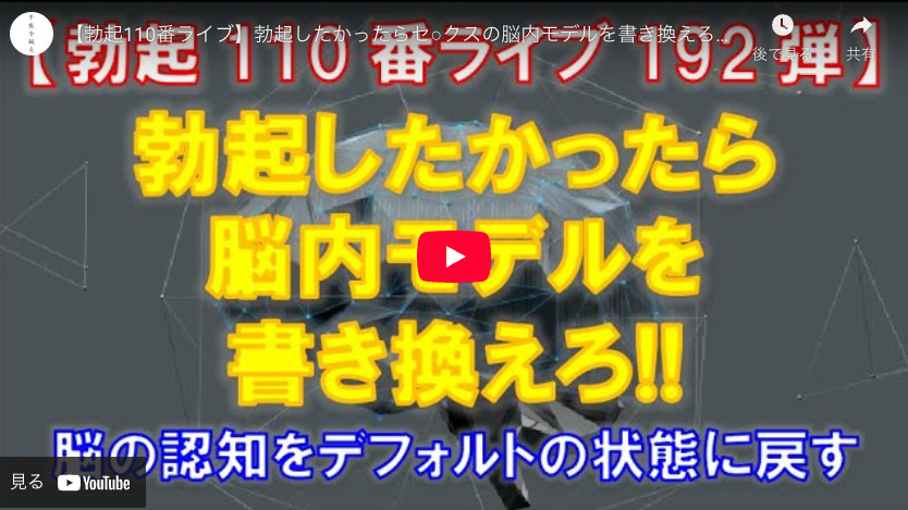 【勃起110番ライブ】勃起したかったらセ○クスの脳内モデルを書き換えろ!! ~脳の認知が変われば勃起という生理現象は自然に起こる~